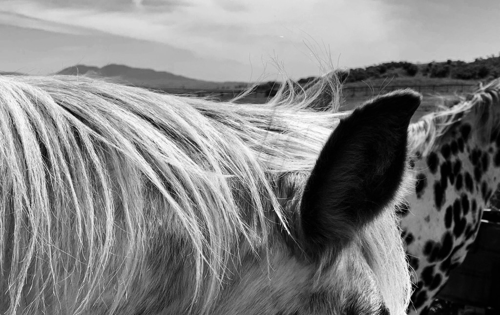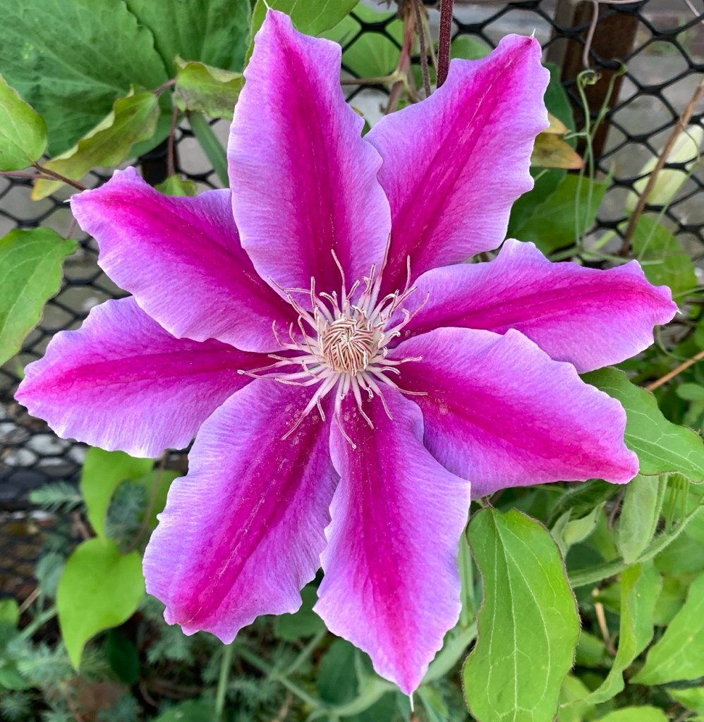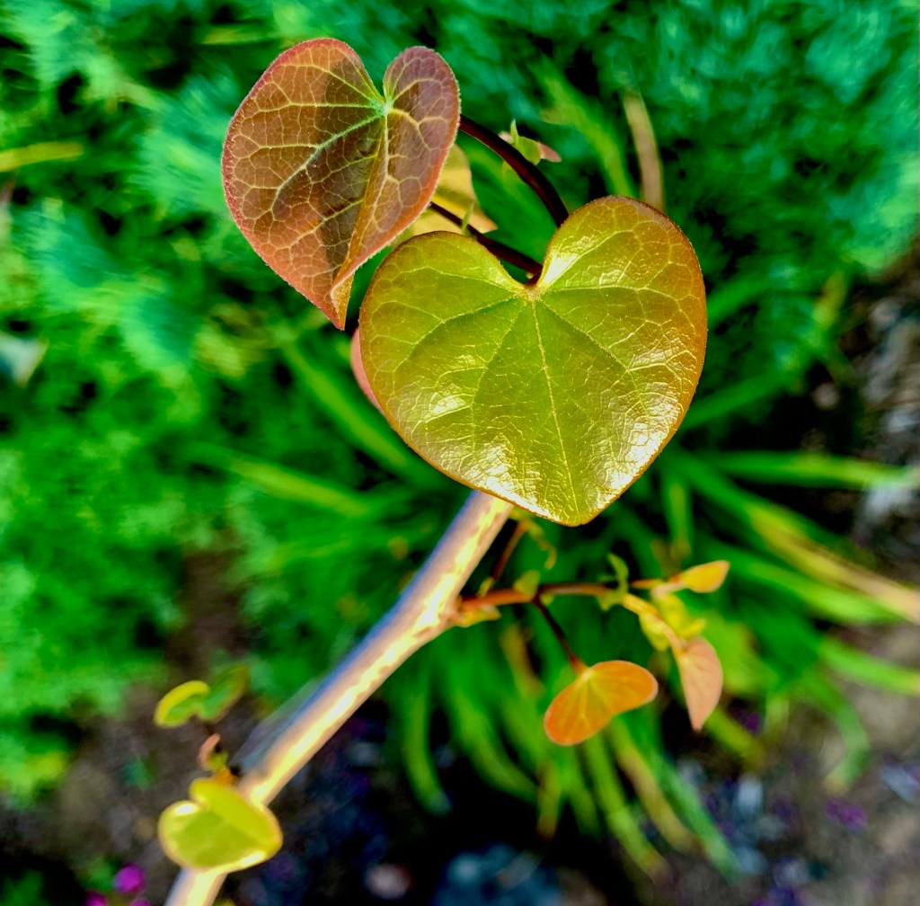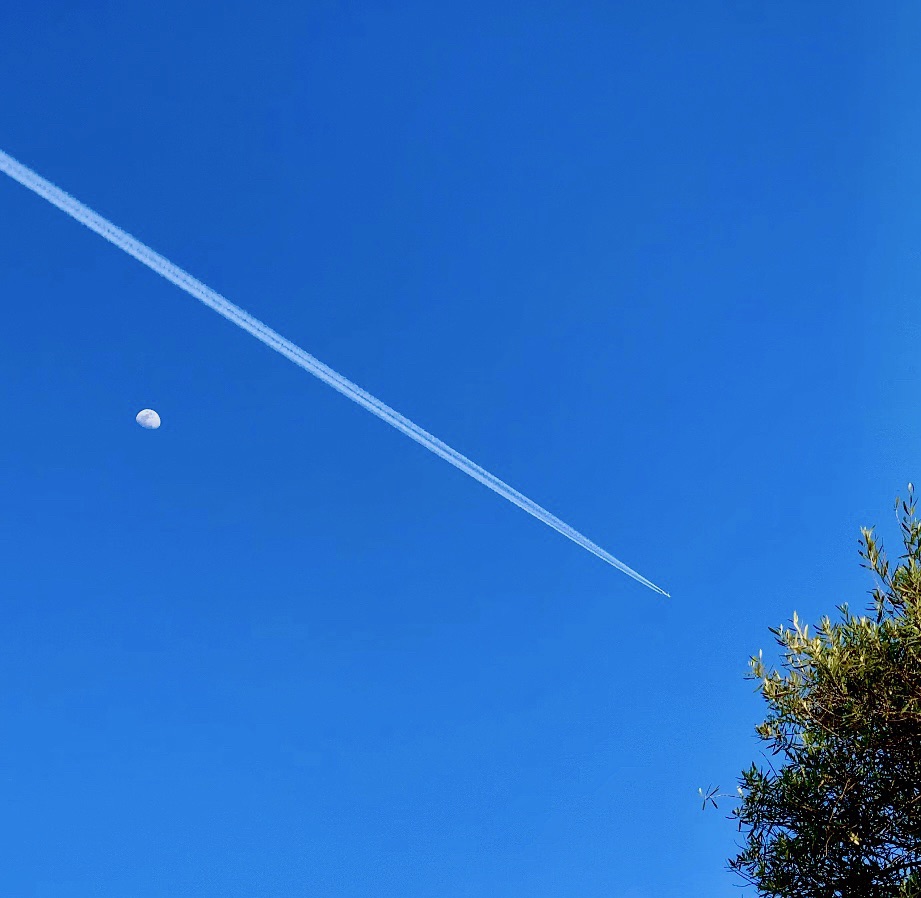 The quince, the hot pink clematis, the 777 headed to LAX with the moon in a clear afternoon sky, heart shaped red bud leaves, and Stonewall horses in a field early afternoon. Loving this weather!