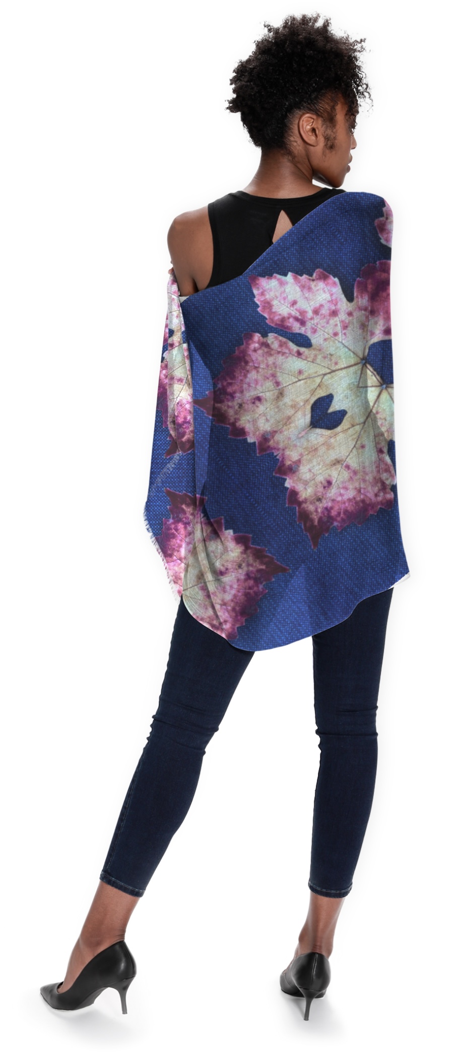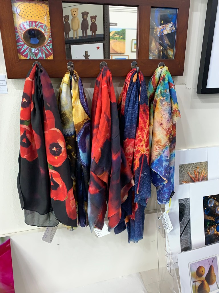Art Scarves – all scarves are $90 including shipping, see my Art Scarves page for more selections. The model here shows three scarves: “Red Cabernet Leaf”,”Bottle Tree”, and “Yellow Cabernet Leaf”. Contact me directly for purchase or more styles/colors.